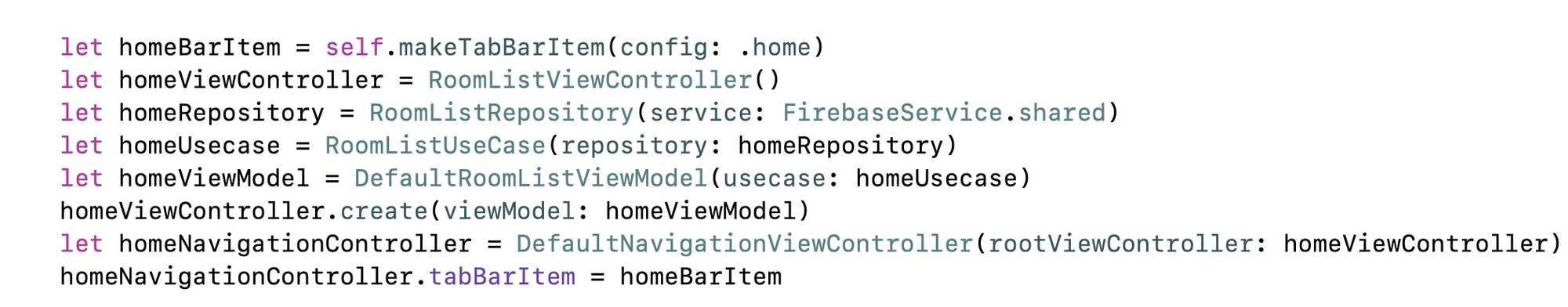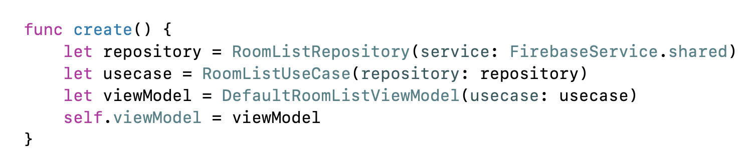 ViewController의 create() 함수안에서 ViewModel, UseCase, Repository를 만든다.