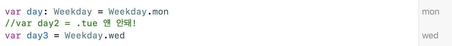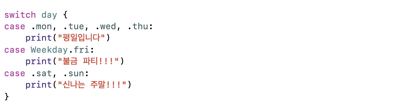 주로 Enum과 switch는 세트로 자주 쓰이며 Enum의 case switch의 case에 다 쓰면 default가 필요 없다.