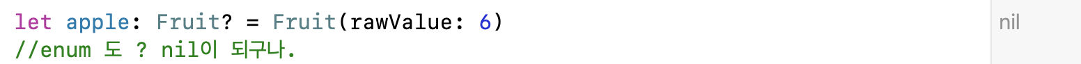 enum 자료형도 nil을 가질 수 있다. rawValue에 원하는 값이 무조건 있을 거란 법이 없기 때문.