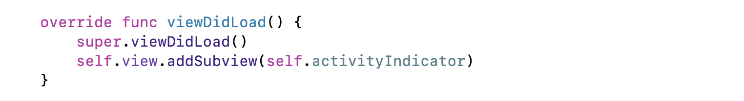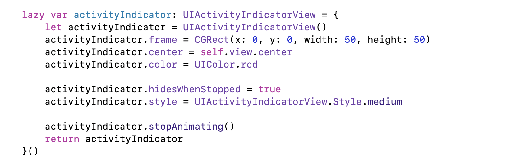 lazy로 구현했습니다. lazy로 구현하면 activityIndicator.center 에서 self를 쓸 수 있습니다. viewDidLoad에서 addSubview하고 인스턴스를 만들기 때문입니다.
