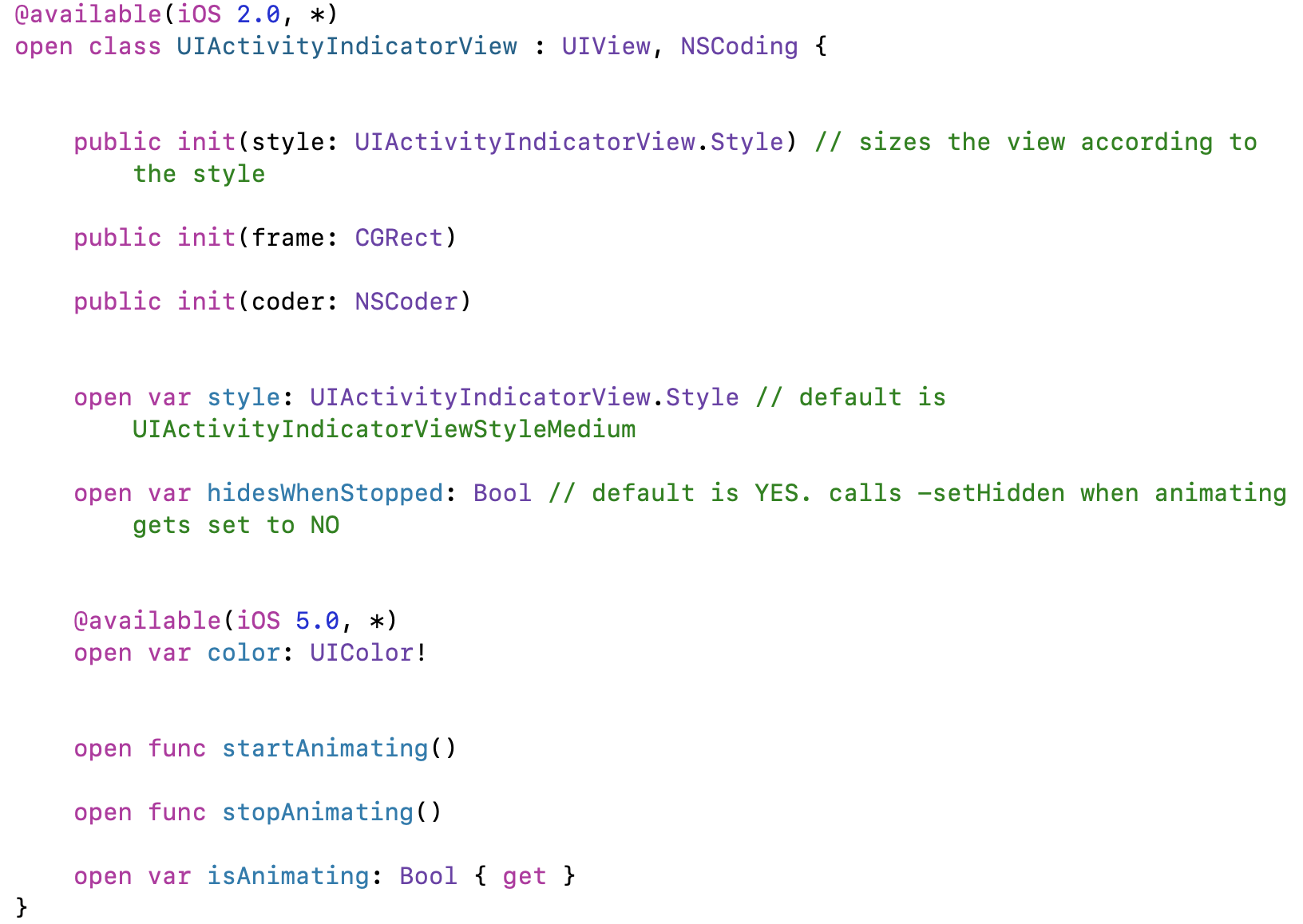 - indicator 애니메이션을 startAnimating() 함수와 stopAnimating()함수로 control할 수 있습니다.