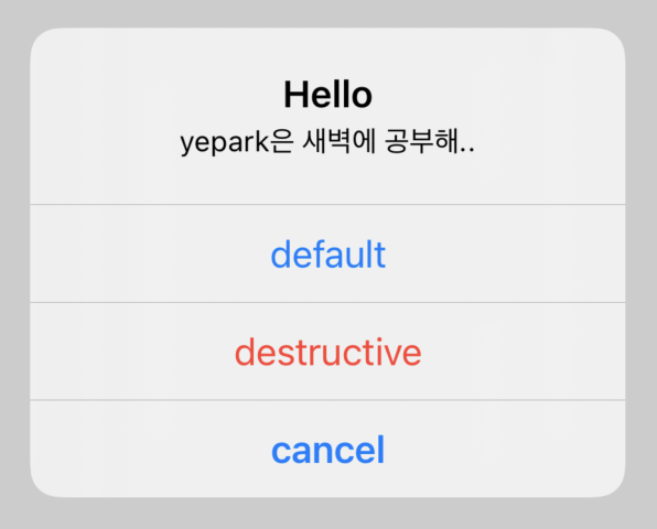 preferredStyle의 값을 액션 갯수에 따라 default만 넣었을 때, default, cancel만 넣었을 때, default,cancel, destructive 세개 넣었을 때 입니다. cancel은 vold가 되어있고 2개일 때는 왼쪽에 3개일 때는 맨 밑으로 위치가 설정됩니다. 그리고 destructive는 빨갛게 글자색이 바뀝니다.. default는 default.