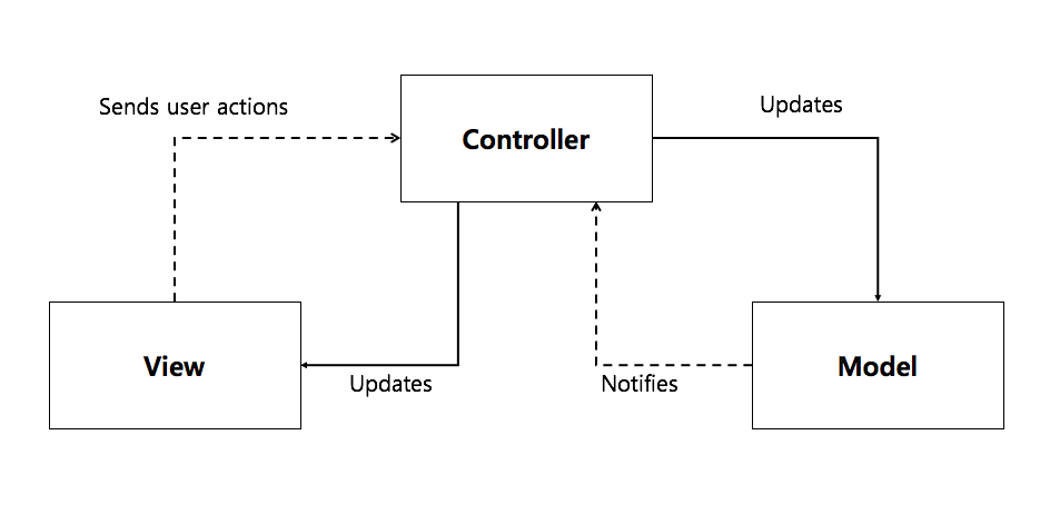 View 앱에서 버튼을 누르는 등 액션을 취하면 Controller에게 알림 그리고 Controller는 View에게서 받은 정보로 Model (data)를 Updates시키고 Model은 Updates 완료됬다고 Controller에게 알리고 Controller는 View에게 Model의 변경된 정보를 앱화면에 업데이트함