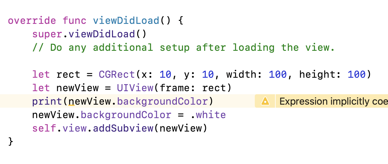 UIView를 생성 할때는 frame이 필요합니다. 그리고 backgroundColor를 지정하지 않으면 nil값이 들어가는데 이 때 투명해서 보이지 않습니다. 저는 white를 넣어봤어요.. addSubview해볼까여!!